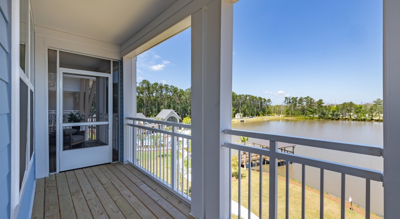 • Woman sitting on her balcony at Marion Lake brand new apartments in Savannah, GA